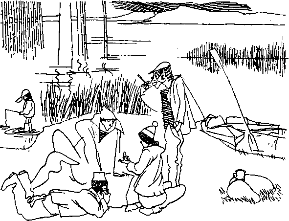 Вы сочувственно посмеиваетесь над наивным зверем и в первые шесть дней бурно радуетесь отсутствию следов цивилизации. На седьмой день у Кока появляется неосознанное желание, на восьмой день приобретающее совершенную определенность: посетить просветительное учреждение, известное под названием "Сельпо". Остальные члены экспедиции еще живут надеждами поймать большую рыбу. Но многоопытный реалист Кок понимает, что шансы выловить это мифическое существо немногим превосходят вероятность поймать на спиннинг пачку макарон или банку колбасного фарша.